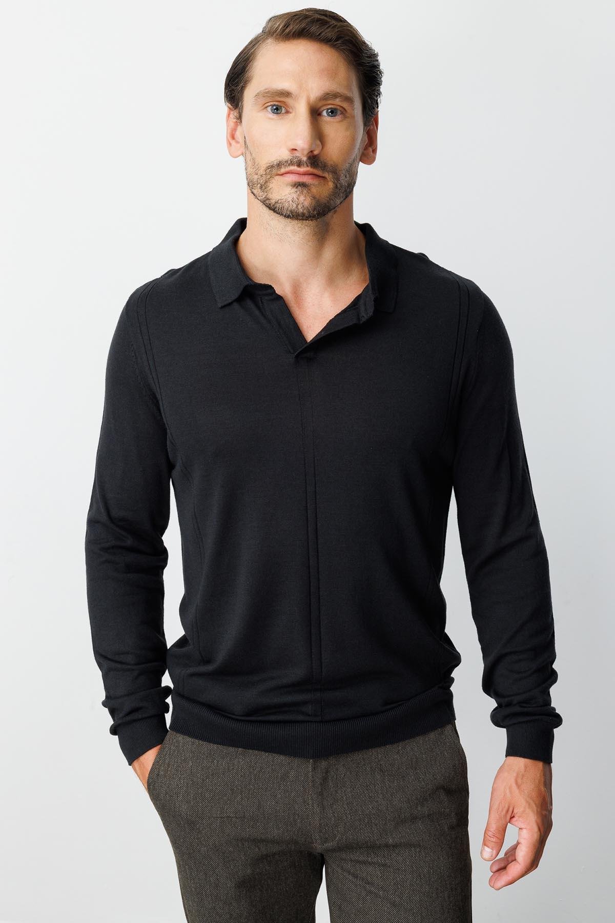 Siyah Standart Fit Polo Yaka Düz Uzun Kollu Triko (21061536STD)